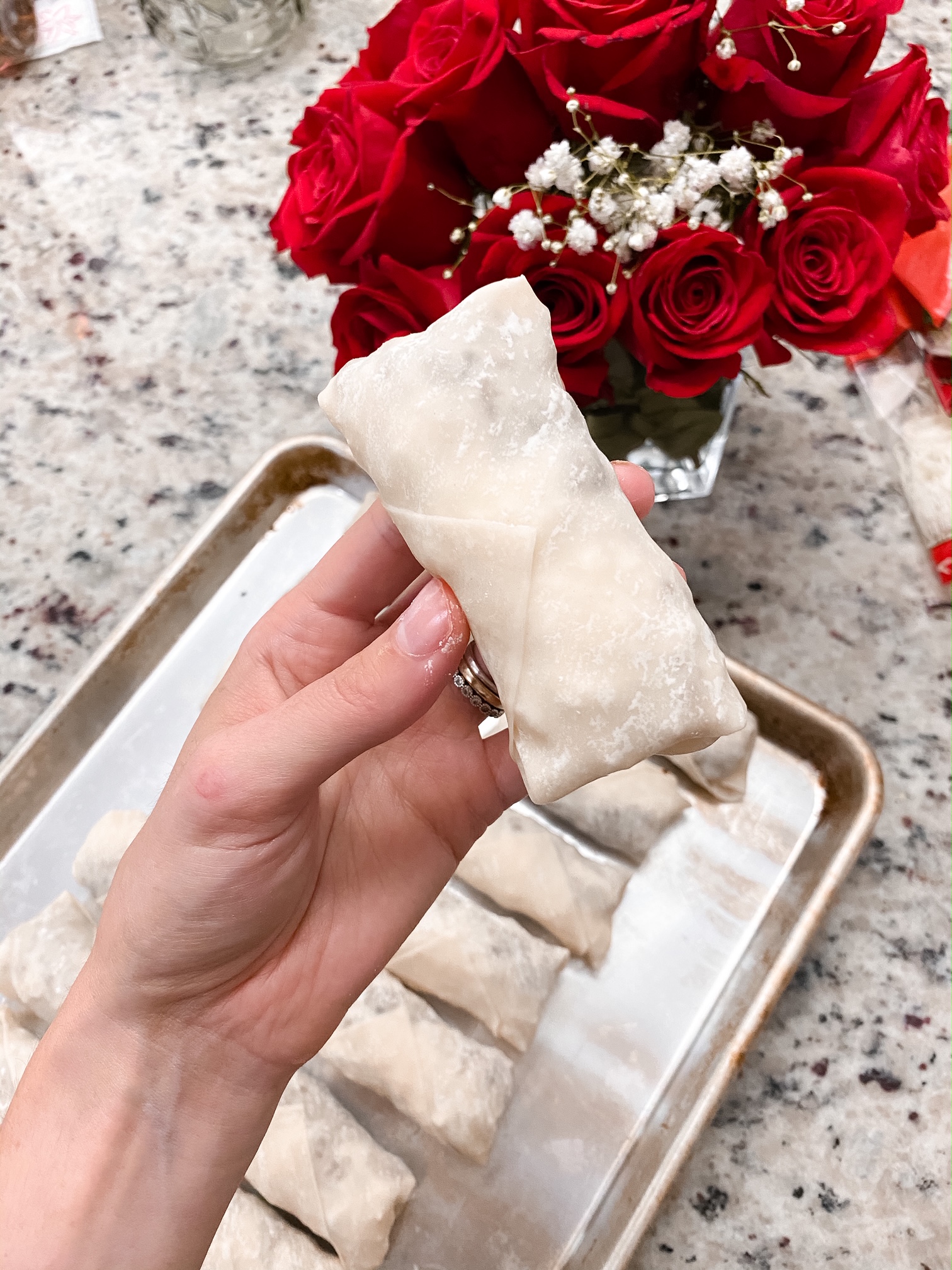 STEP 3: Wet your fingertips in the water, and run them along 2 adjacent sides of the egg roll, essentially forming a ‘V’. This will help the egg roll adhere to itself and stay together when you roll it up! Bring the opposite dry ‘V’ upwards, about 1/2 way towards the damp V, tuck in the opposing sides, then roll it up like a burrito! Place on a cookie sheet.